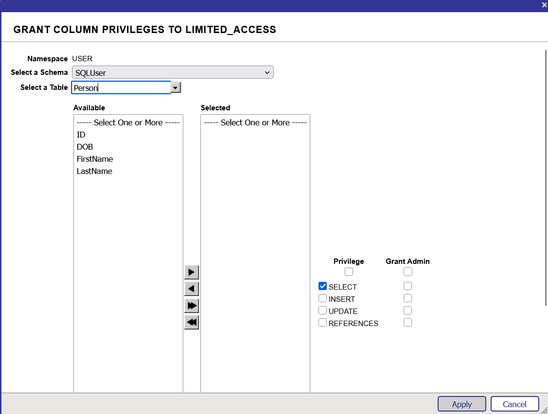 We will create a role called limited_access which will implement some column security, but the first thing we must remember to do is make sure to add the %DB_User resource to this role so that the user has access to the database. Once we’ve done that, we can begin to think about columns. We will go to the SQL Tables tab in the role setup and ensure that the USER namespace is selected. Then we will click the Add Columns button, which is to the right of the Add Tables button. This will open the dialog where we will control column permissions.