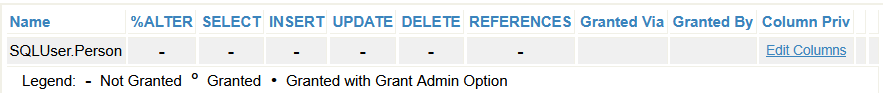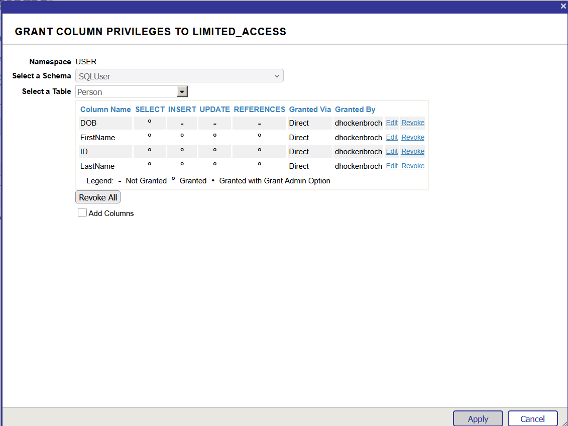 This is where we can modify or revoke specific column permissions. If we check the Add Columns box, the initial configuration form for adding columns will reappear below, allowing us to make further additions. If you ever encounter a table listed in a role that appears to lack defined privileges, you should click the Edit Columns link to check for column-specific permissions.