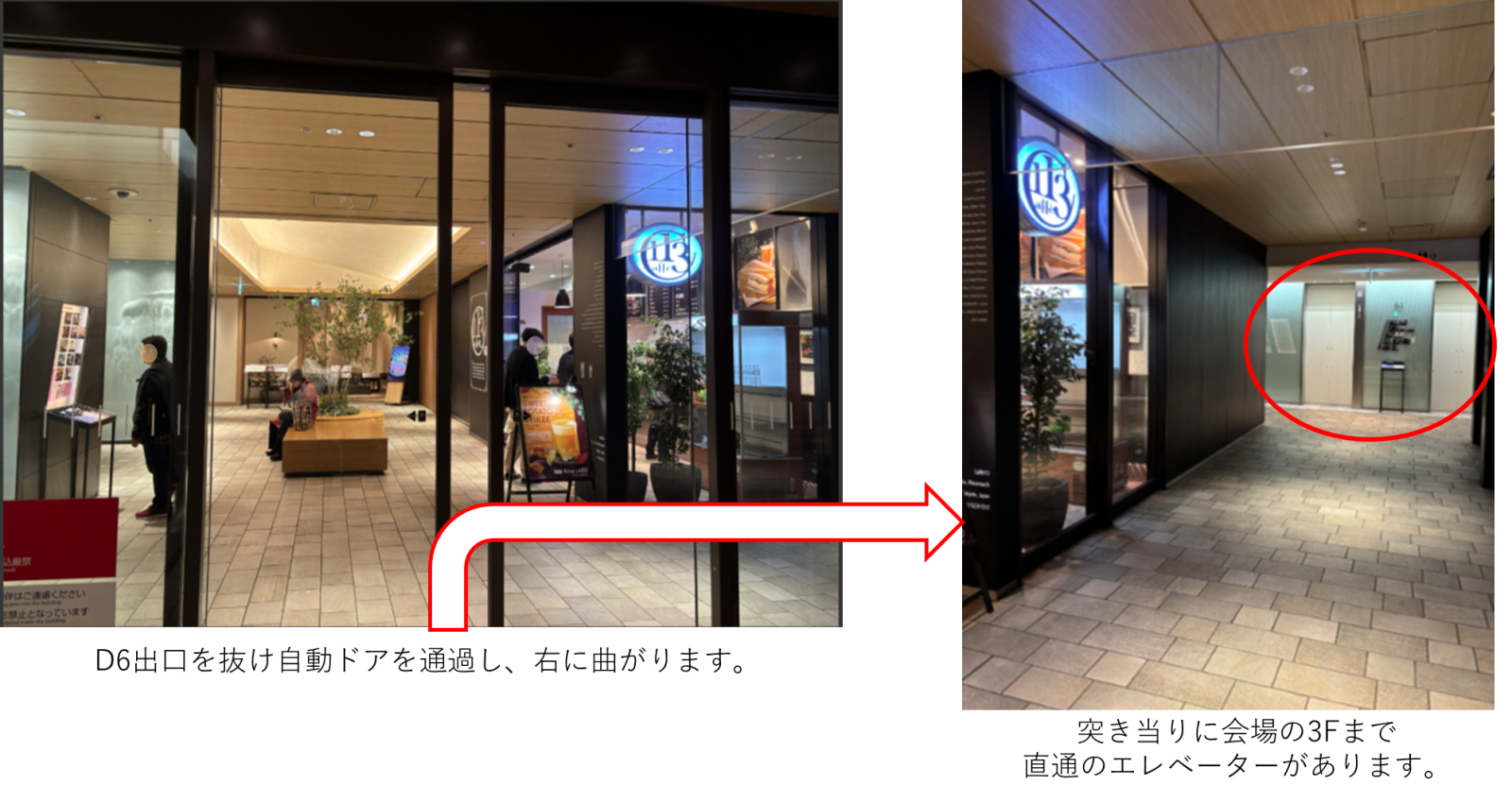 地下鉄 D6 出口からの進み方は以下の通りです(自動ドアを通過し、右奥にある3階まで直通のエレベーターを利用すると便利です)。