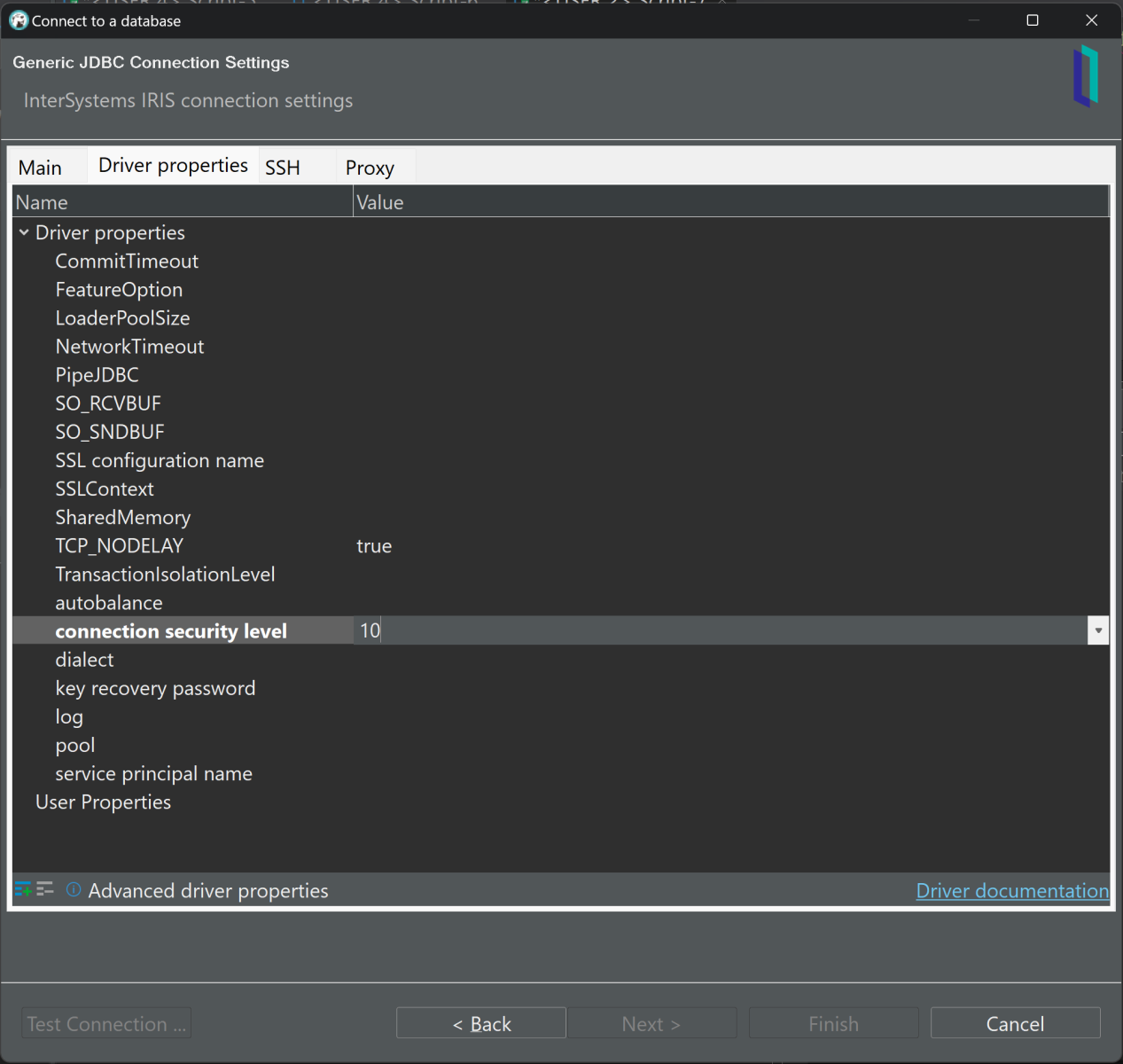 The only thing left to do is to tell DBeaver to enable encryption, which is accomplished by setting the "connection security level" to 10 in the "Driver properties" tab: