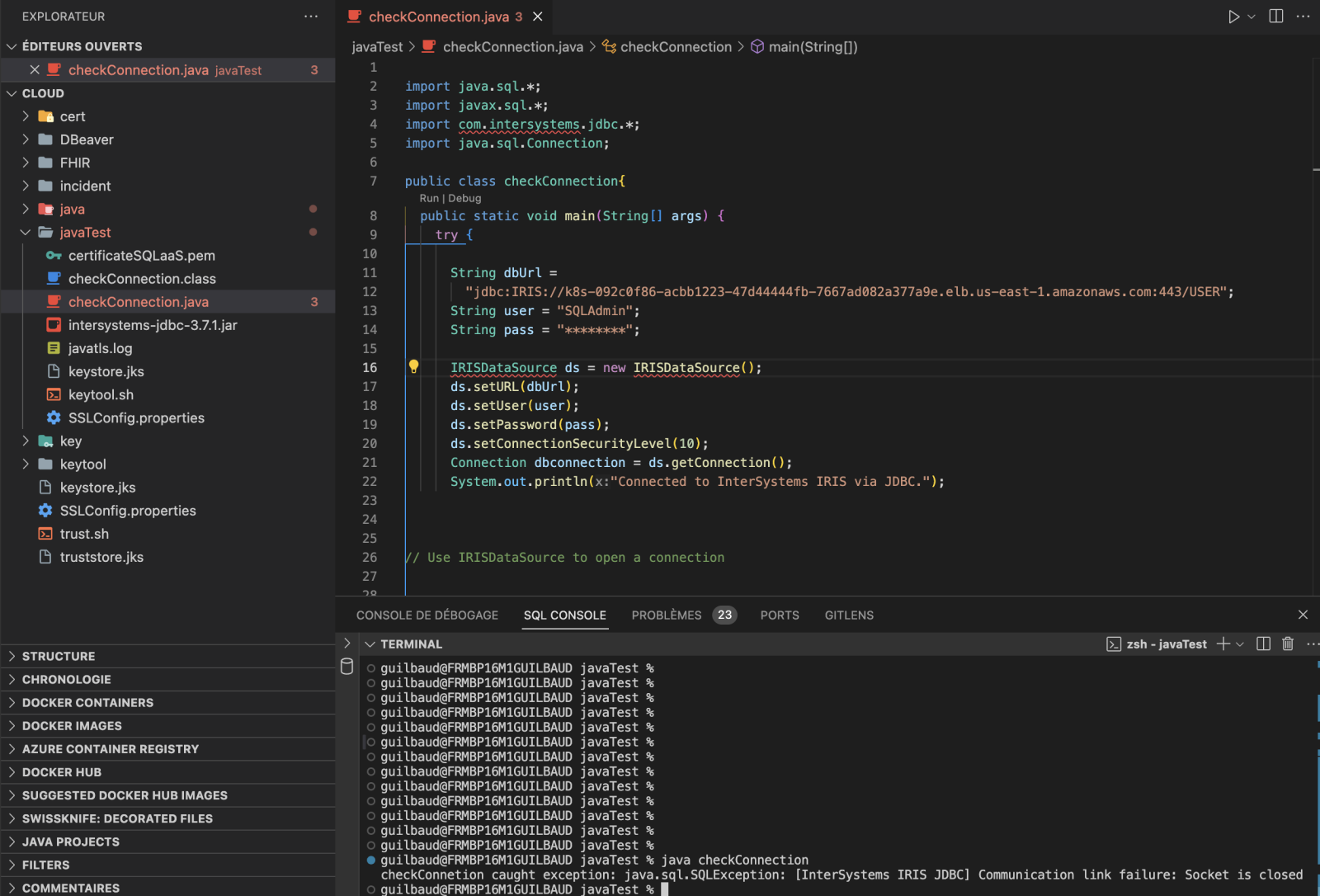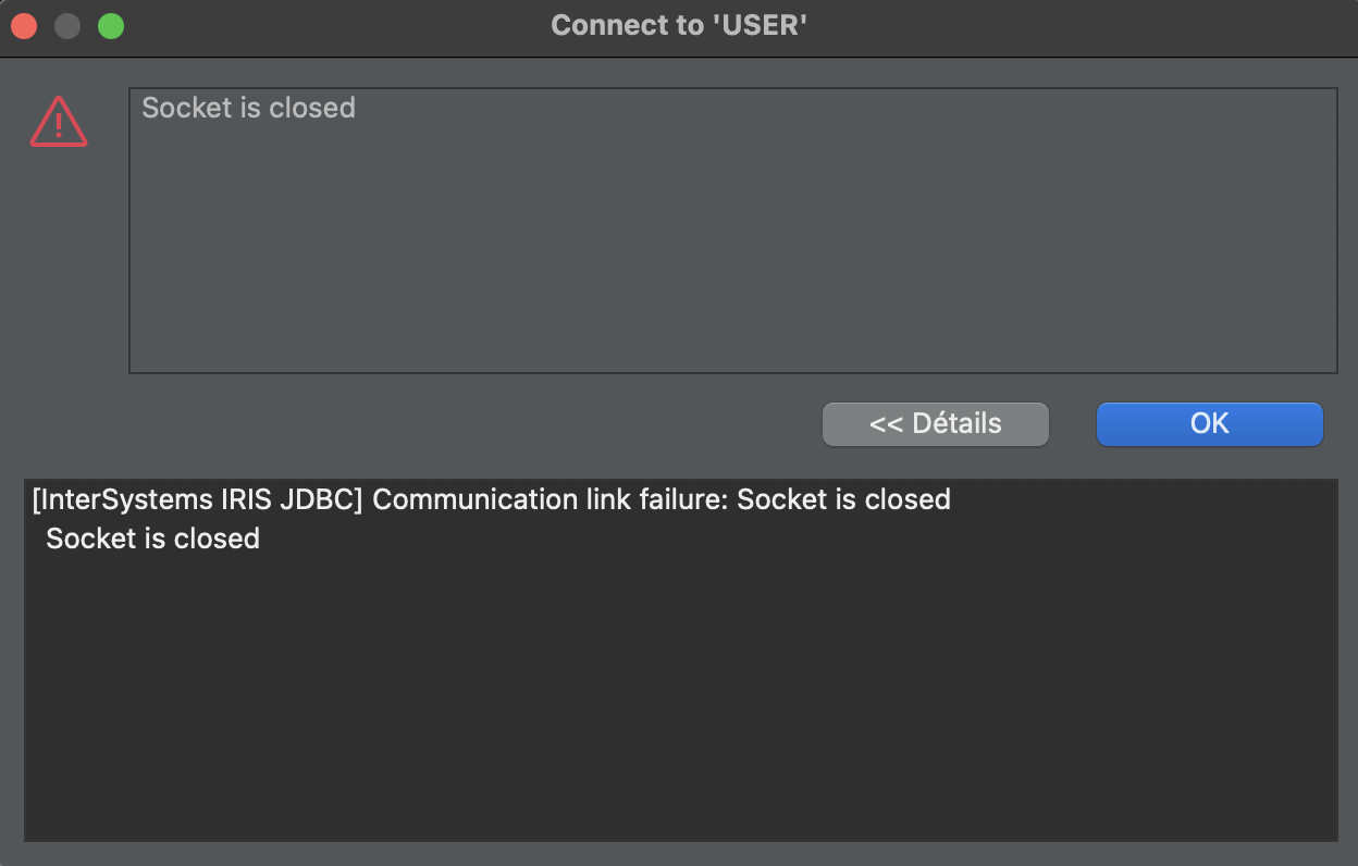 checkConnection caught exception: java.sql.SQLException: [InterSystems IRIS JDBC] Communication link failure: Socket is closed