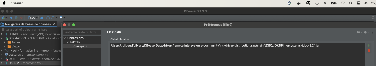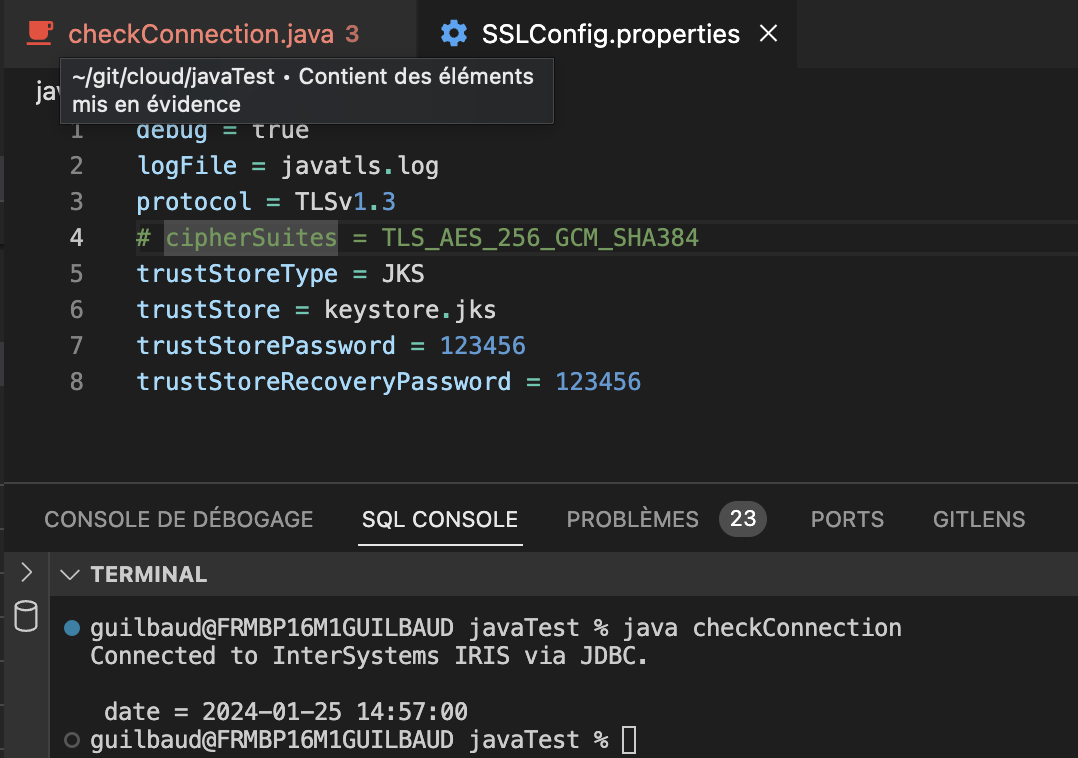 Next, we'll need to tell the IRIS JDBC driver how to find this keystore, which is accomplished through an SSLConfig.properties file. This simple text file needs to be placed in the working directory of the Java program that'll open the JDBC connection. On Windows, that's %LOCALAPPDATA%\DBeaver, which translates to C:\Users\<you>\AppData\Local\DBeaver. On Mac, it's typically /Applications/DBeaverEE.app/Contents/MacOS. As an alternative, you can also create the file elsewhere and set the full path as an environment variable named com.intersystems.SSLConfigFile.