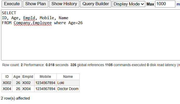 SELECT ID, Age, EmpId, Mobile, NameFROM Company.Employee WHERE Age = 26