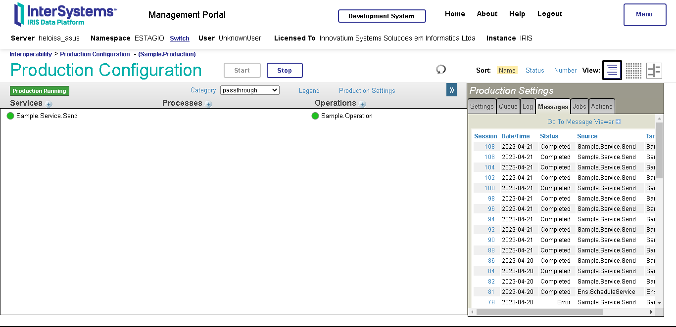 Para cada produção que construímos, o Portal de Administração do InterSystems IRIS cria uma interface que exibe todos os componentes conectados e cada mensagem relacionada a seu comportamento.