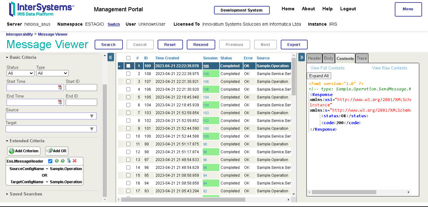 Deixe-me explicar essa complexidade. Ainda que não pareça fazer uma grande diferença para um desenvolvedor ler uma simples mensagem com apenas uma propriedade string em tags (<tags>) ou formato JSON, também é importante fazer essa mensagem parecer familiar para os não-desenvolvedores que podem ter acesso a esse portal e devem ser capazes de entender de um modo geral o processamento da informação, já que JSON é muito mais amigável ao usuário. Além disso, quando as mesagens carregam propriedades de outros objetos ou tipos, somente serão enviadas adequadamente em JSON se têm a adaptação apropriada para isso. O IRIS torna isso fácil de resolver simplesmente estendendo a classe %JSON.Adaptor. Ao mesmo tempo, mensagens só aparecerão no Visualizador de Mensagens se têm a adaptação adequada para XML, que o IRIS também torna fácil estendendo %XML.Adaptor. Ainda assim, se o Visualizador de Mensagens mostrasse em JSON, esse último problema não existiria. De forma prática, isso significa diminuir a quantidade de dependências do projeto, o que, em idioma humano, significa reduzir o número de coisas que podem dar errado enquanto desenvolve e quando atualizações futuras do projeto ou até mesmo do IRIS saírem. E além de tudo, você não precisa de um time capacitado para lidar com XML.