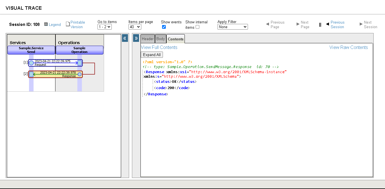 PS.: você também pode clicar no número da Sessão na tabela para obter uma visão focada do rastreamento ao lado da aba de Header, Body e Contents, como exemplificado na imagem abaixo