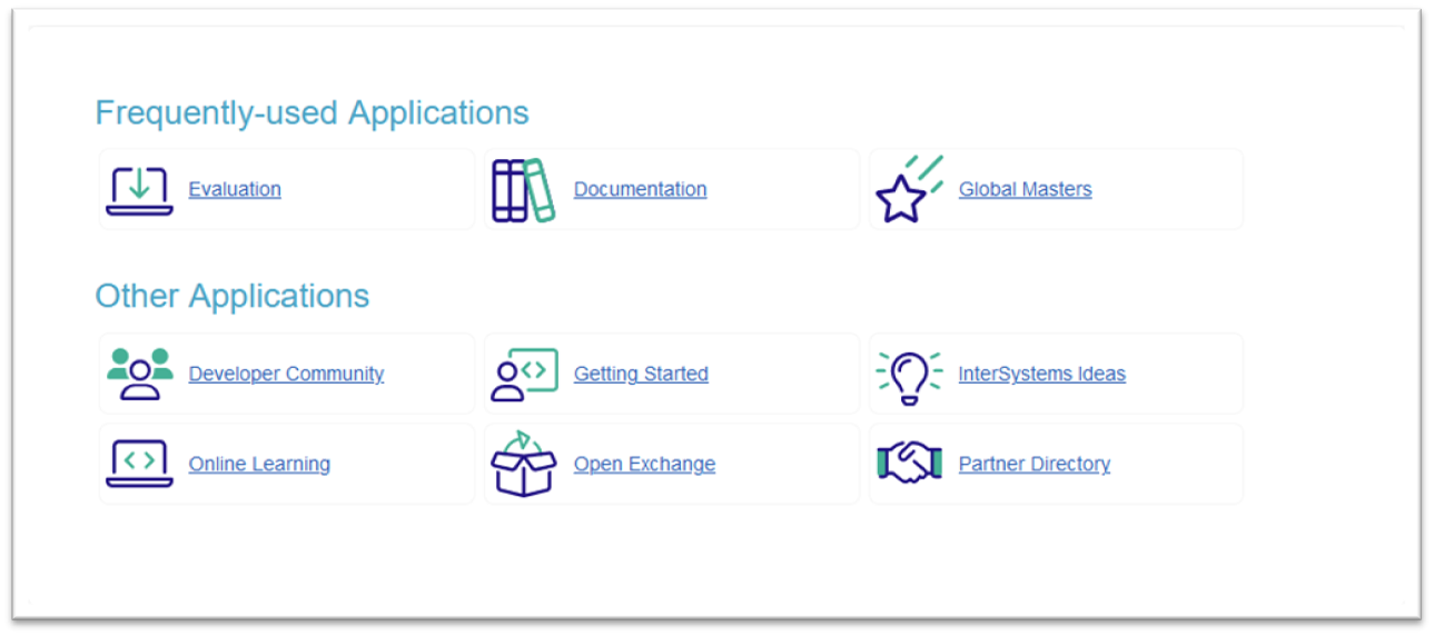 Você pode ver todos os serviços disponíveis para você com sua conta de login da InterSystems ao acessar esse catálogo de aplicativos da InterSystems, localizado em:  https://Login.InterSystems.com.  Isso só listará os aplicativos ou serviços a que você tem acesso no momento.  Ele lembra seus aplicativos usados com mais frequência e os lista na parte superior para sua conveniência.