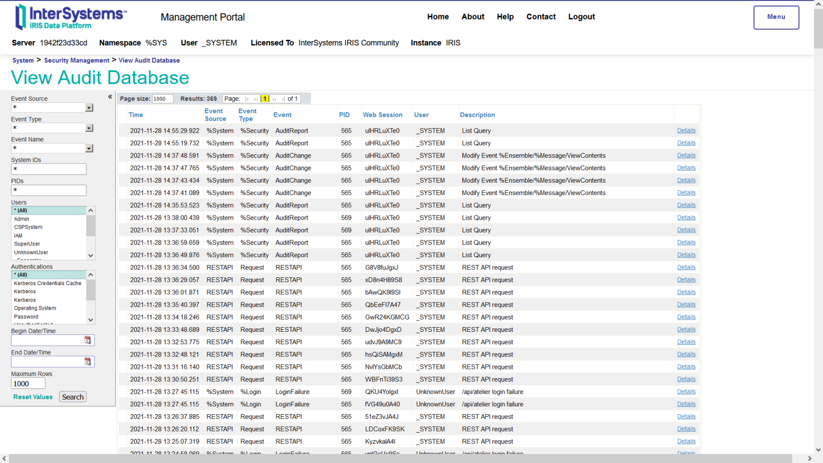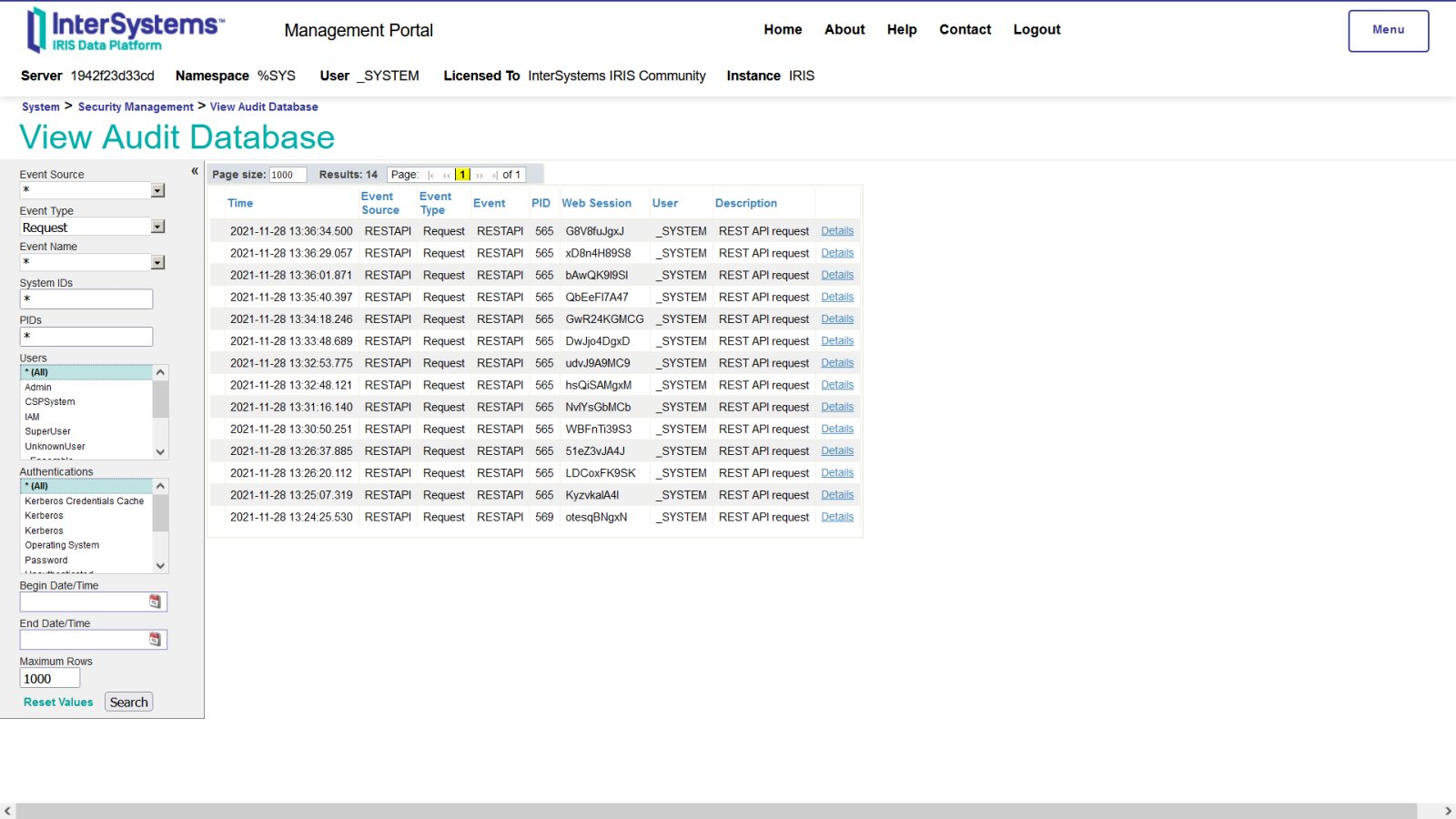 12. Agora vá para System Administration > Security > Auditing > View Audit Database