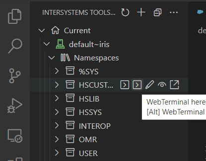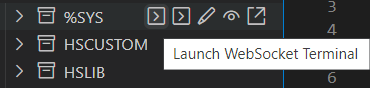 Para abrir o WebSocket Terminal, clique em: InterSystems Tools > selecione um namespace > clique no ícone ao lado do correspondente ao Web Terminal.