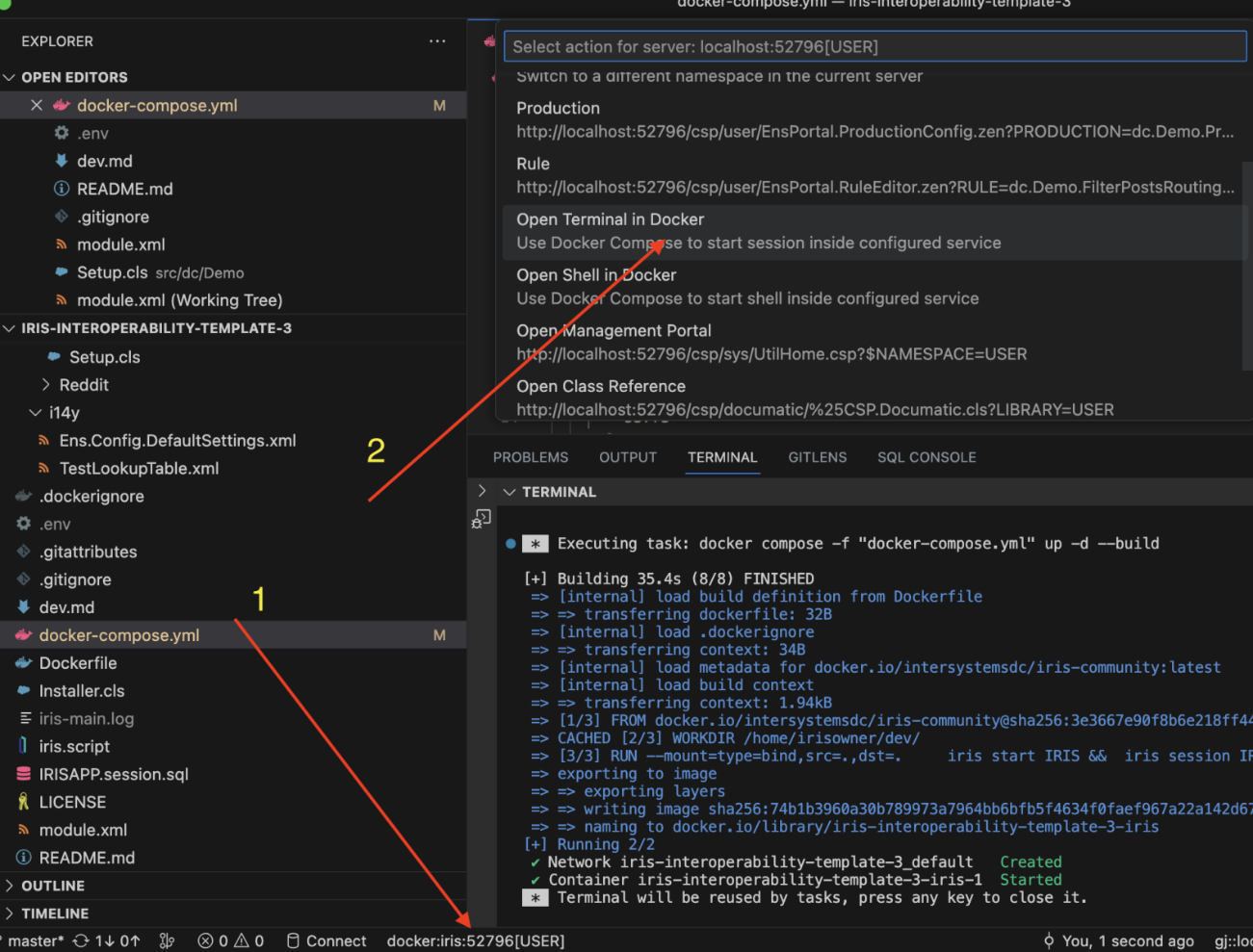 Quem trabalha com ambientes do IRIS no Docker e usa o VSC pode iniciar uma sessão de terminal diretamente no ambiente do Docker.