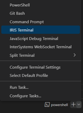 c. Para abrir o terminal a partir do VSC, navegue até: Terminal > New Terminal (Novo terminal) > Launch Profile… (Inicializar perfil) > IRIS Terminal.