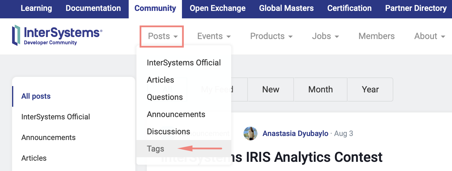 - Um grupo de tag para anúncios oficiais sobre a Comunidade de Desenvolvedores ou sobre a InterSystems: