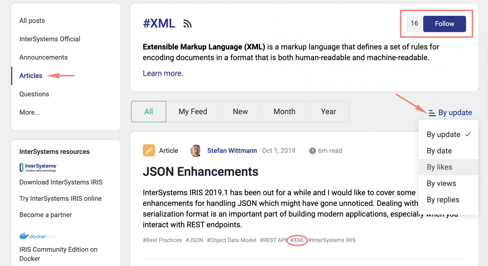 Por exemplo, a tag "XML" está vinculada a esta página: community.intersystems.com/tags/xml, exibindo todas as postagens que utilizam esta tag: