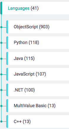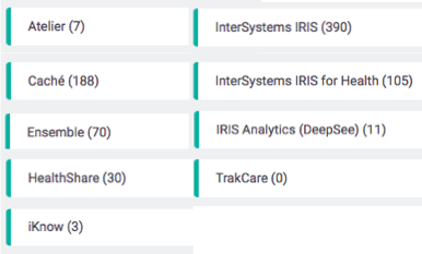 - Grupos – também chamadas de tags principais para assuntos abrangentes e incluem todas as tecnologias InterSystems.