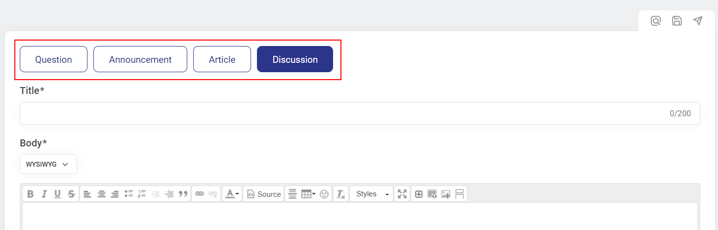 Depois disso, você verá o editor que lhe dará a opção de criar uma Pergunta, um Anúncio, um Artigo ou uma Discussão. Diferentes tipos de postagens têm seus próprios conjuntos de campos obrigatórios e opcionais.