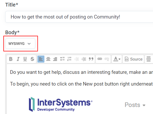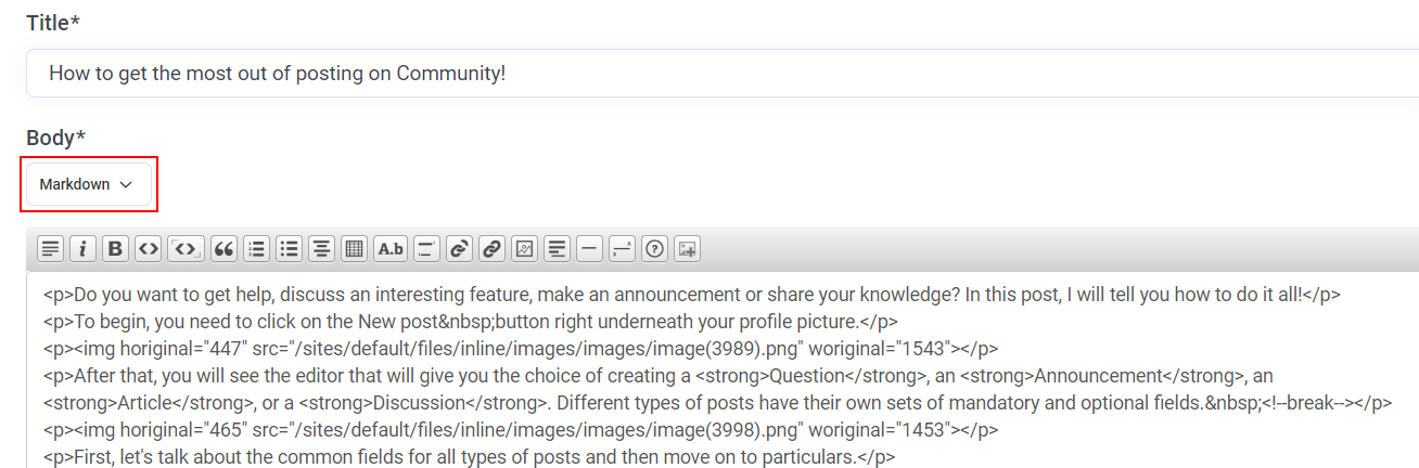 Depois disso, no Corpo, você escreve o que quiser compartilhar com os outros. Existem duas opções para escolher ao escrever o texto do seu post. Você pode usar o editor WYSIWYG ou Markdown. Ambos vão te dar a mesma coisa como resultado, é claro.