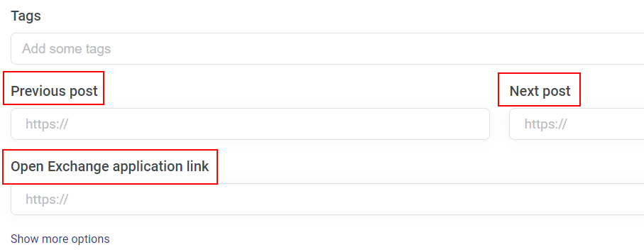 Para compartilhar seu conhecimento ou fazer um anúncio você deve escolher um tipo de postagem de Artigo ou Anúncio respectivamente. Esses tipos de postagens, além dos campos comuns, também possuem alguns adicionais. Esses são o Post Anterior, o Próximo Post e o link do aplicativo Open Exchange.