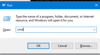 - Na VM, pressione a tecla Windows e a tecla R. Isso abre a caixa de diálogo Executar (como mostrado abaixo). Digite "cmd" e clique em<OK>: