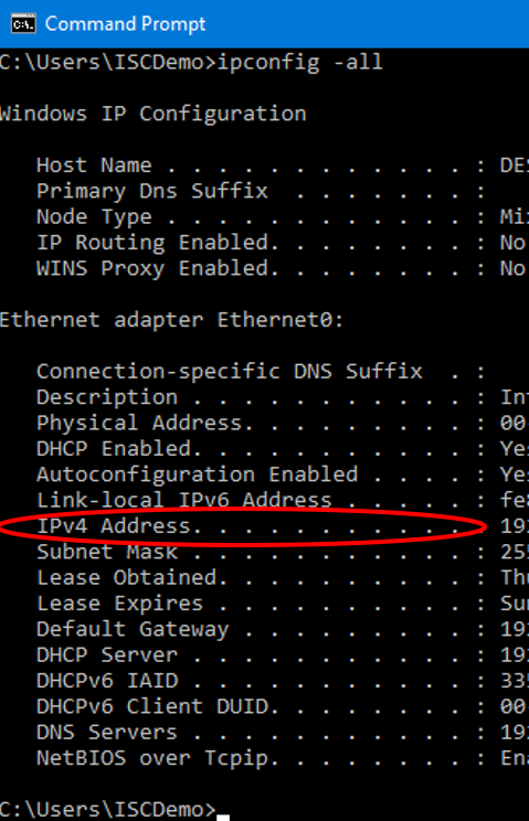 - No Prompt de Comando, digite "ipconfig -all" para encontrar seu endereço IP. Localize a linha que diz "IPv4 Address…." e anote o endereço IP numérico nessa linha: