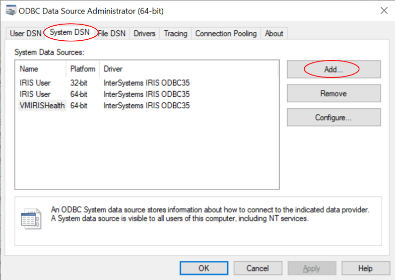 - No ODBC DSA, abra a guia "System DSN" (DSN do sistema) e clique em "Add" (Adicionar):