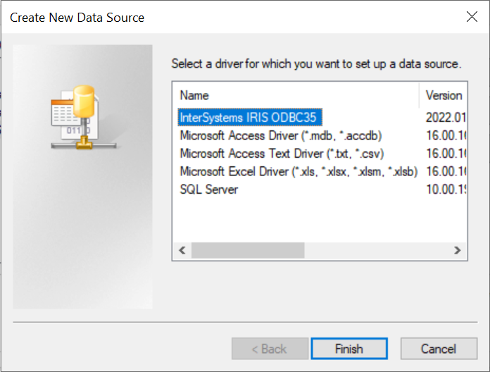 - Você precisará selecionar um driver para a origem de dados. Se você instalou o InterSystems ODBC driver na sua máquina Windows nativa, selecione "InterSystems IRIS ODBC…" como fiz abaixo e clique em "Finish" (Concluir):