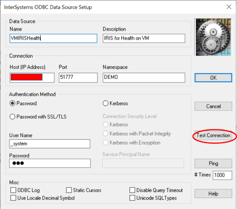 - Isso abrirá uma nova caixa de diálogo onde você precisa nomear a origem de dados, fornecer uma descrição, inserir o endereço IP copiado antes e a Porta do Servidor Web. Digite o namespace que você quer conectar, além do nome de usuário e senha que você usa para o Portal de Gerenciamento. Em seguida, clique em <Test Connection> (Testar conexão) conforme mostrado abaixo: