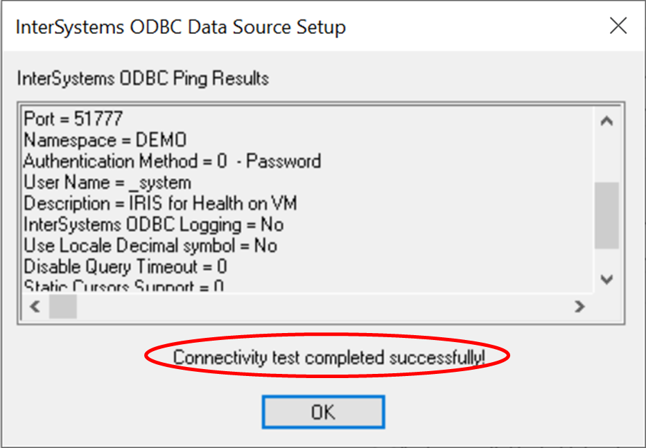 - Se deu tudo certo, você verá test completed successfully (teste concluído com sucesso) conforme mostrado abaixo. Isso significa que agora temos uma conexão pelo nosso Windows nativo ao IRIS na VM: