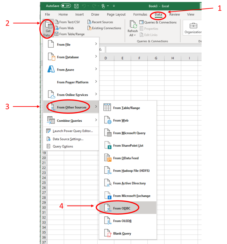Agora, podemos abrir o Microsoft Excel e acessar os dados pela origem de dados ODBC. Para isso, selecionamos a guia "Data" (1) e clicamos em "Get Data" (2). Clique em "From Other Sources" (3) e, depois, em "From ODBC" (4).