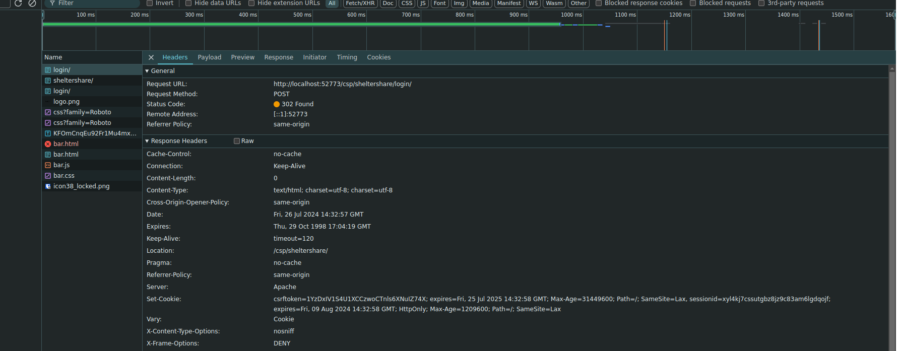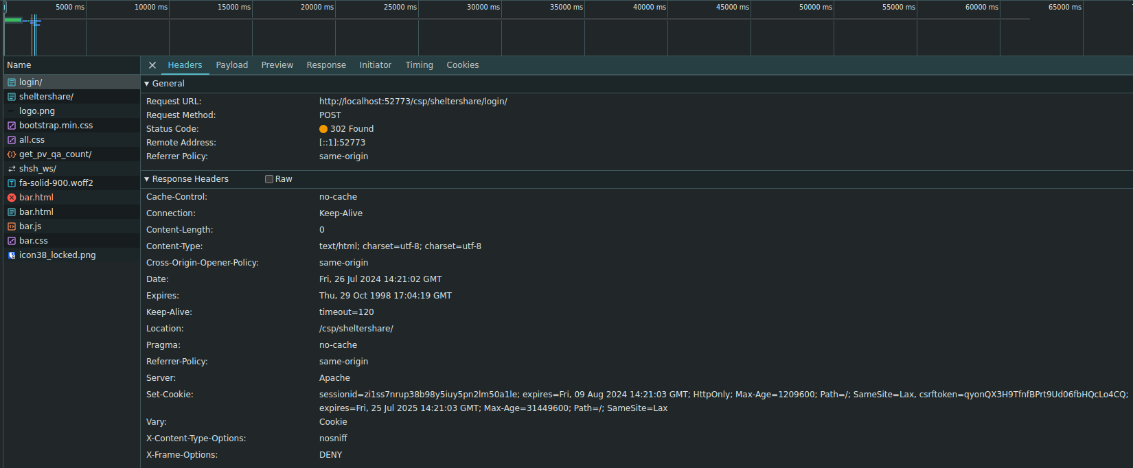 return responsee agora a sessionid e CSRF estavam ainda na mesma header Set-Cookie, mas o id de sessão estava bem no começo do Set-Cookie, então o browser conseguiu obtê-lo sem problemas