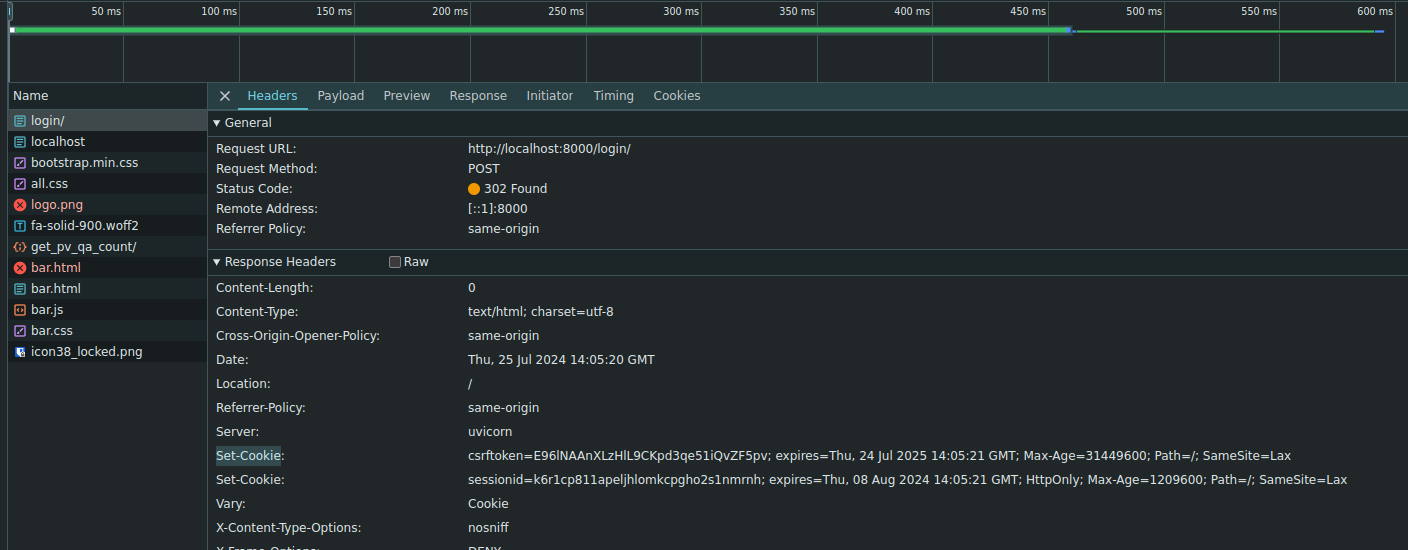 Após muito procurar, debugar o console browser e inspecionar, verificamos que em circunstâncias normais, o servidor WSGI/ASGI em questão (exemplo uvicorn, gunicorn) vai fazer o login com sucesso retornar 2 parâmetros de cookie nas headers, um com um token CSRF e algumas outras informações, enquanto o outro contém o id de sessão.