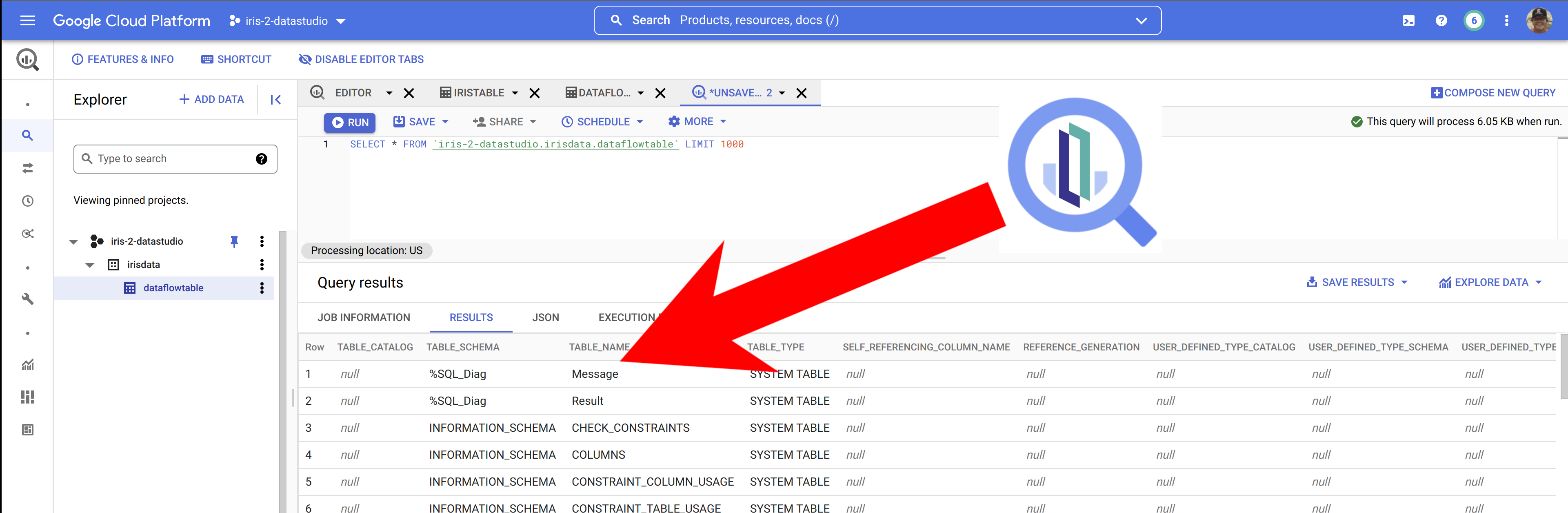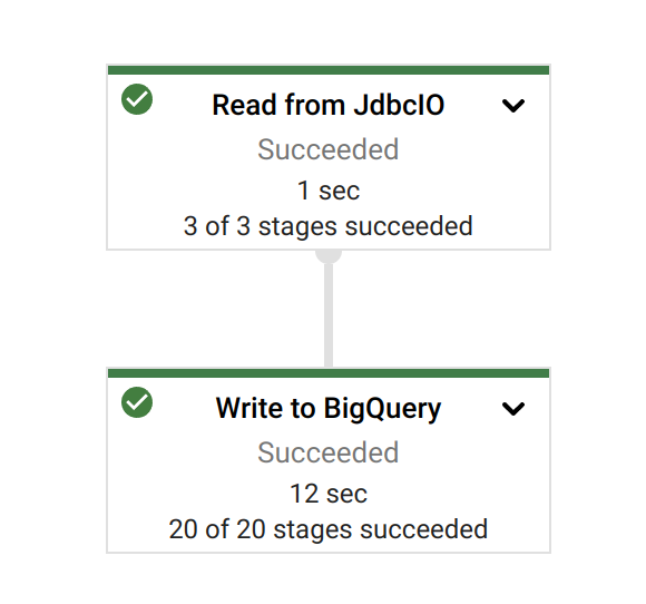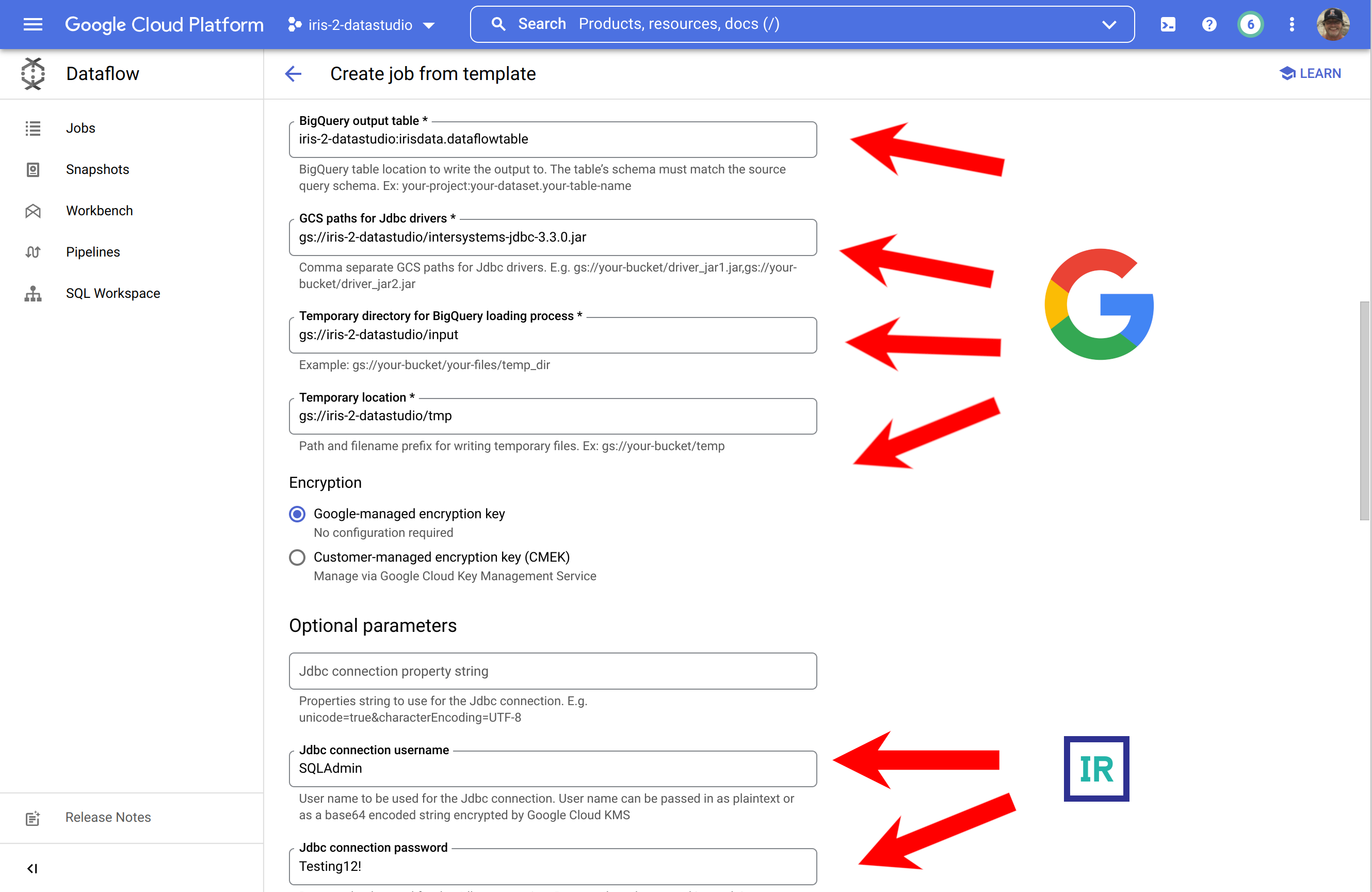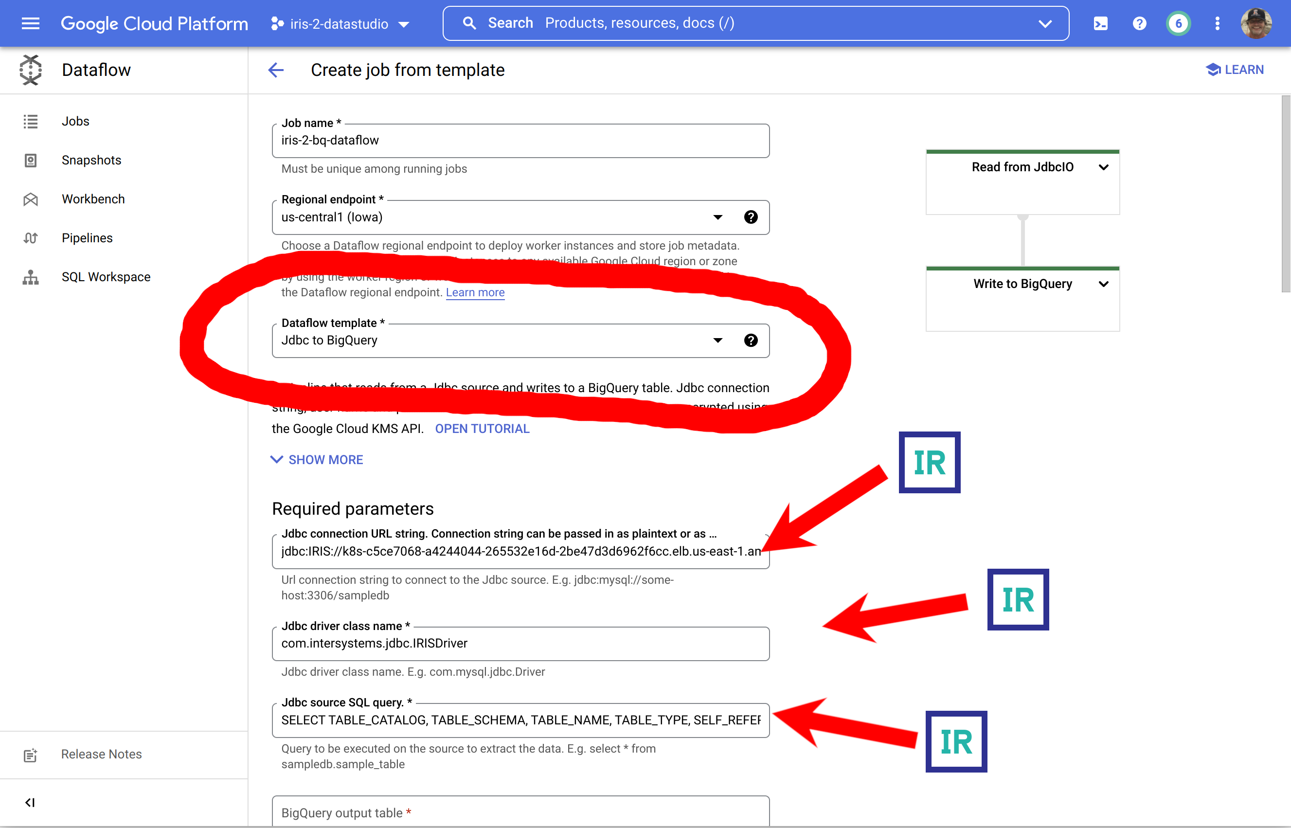 gcloud dataflow jobs run iris-2-bq-dataflow \ --gcs-location gs://dataflow-templates-us-central1/latest/Jdbc_to_BigQuery \ --region us-central1 --num-workers 2 \ --staging-location gs://iris-2-datastudio/tmp \ --parameters connectionURL=jdbc:IRIS://k8s-c5ce7068-a4244044-265532e16d-2be47d3d6962f6cc.elb.us-east-1.amazonaws.com:1972/USER,driverClassName=com.intersystems.jdbc.IRISDriver,query=SELECT TABLE_CATALOG, TABLE_SCHEMA, TABLE_NAME, TABLE_TYPE, SELF_REFERENCING_COLUMN_NAME, REFERENCE_GENERATION, USER_DEFINED_TYPE_CATALOG, USER_DEFINED_TYPE_SCHEMA, USER_DEFINED_TYPE_NAME, IS_INSERTABLE_INTO, IS_TYPED, CLASSNAME, DESCRIPTION, OWNER, IS_SHARDED FROM INFORMATION_SCHEMA.TABLES;,outputTable=iris-2-datastudio:irisdata.dataflowtable,driverJars=gs://iris-2-datastudio/intersystems-jdbc-3.3.0.jar,bigQueryLoadingTemporaryDirectory=gs://iris-2-datastudio/input,username=SQLAdmin,password=Testing12!