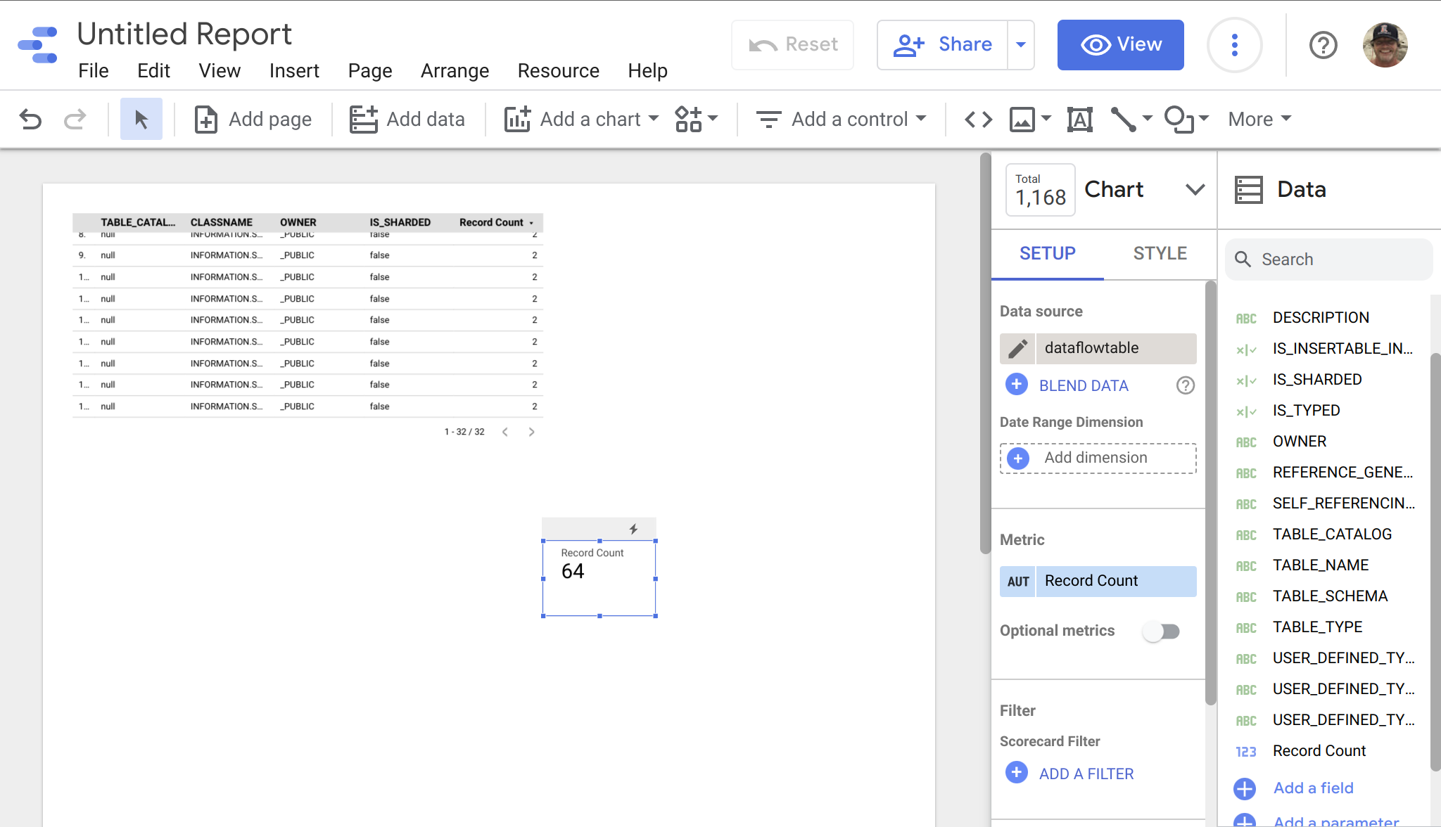 Depois de ter os dados no Big Query, é simples incluir nossos dados do IRIS no Data Studio ao selecionar o Big Query como fonte de dados... o exemplo abaixo não é muito elegante, mas você pode ver rapidamente os dados do IRIS prontos para manipulação no seu projeto do Data Studio.