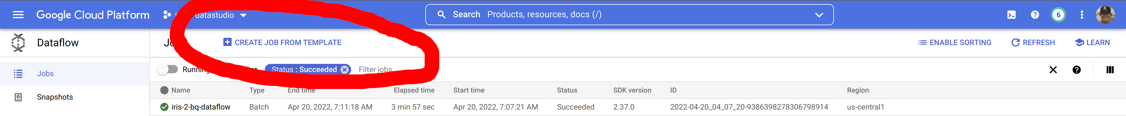 No Console do Google Cloud, acesse o Dataflow e selecione "Criar job a partir do modelo"