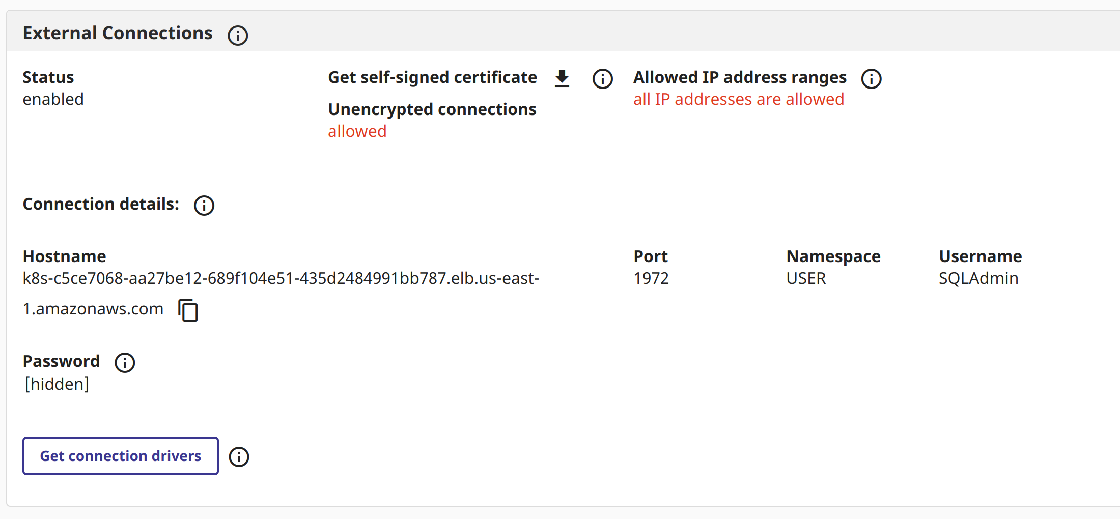 Ao inspecionar sua implantação, você pode acessar o painel "Conexões externas" na guia de visão geral, criar um URL de conexão e manter suas credenciais. Fomos diretamente para o acesso público (0.0.0.0/0) ao listener e escolhemos não critografá-lo.