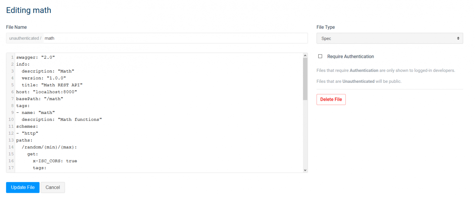 Clique no botão Add Spec e insira o nome da nova API (math em nosso caso). Depois de criar uma nova especificação no IAM, clique em Edit e cole o código da especificação (JSON ou YAML - não importa para o IAM):