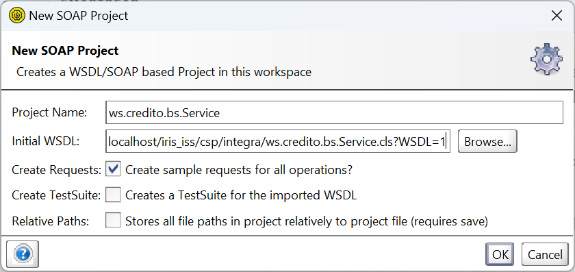 Abra então o SoapUI e importe o WSDL. Vá em File->New SOAP Project e na janela que será apresentada coloque o endereço do WSDL na caixa Initial WSDL e a seguir clique em OK: