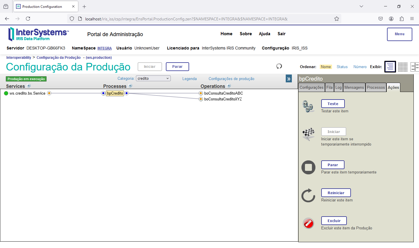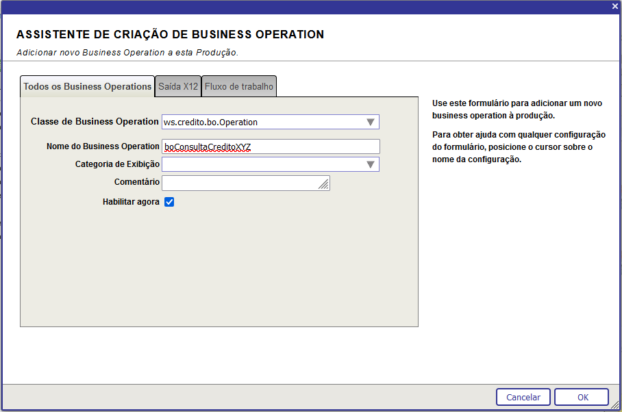 Feito o código do BO vamos coloca-lo na production. Primeiro vamos colocar o BO com o nome de boConsultaCreditoABC. Para isso clique no botão de (+) ao lado do nome Operations na nossa production e preencha a tela conforme abaixo: