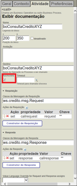 O nosso BP tem agora dois BOs que estão sendo chamados sem espera e depois tem um componente SYNC que aguarda o retorno destas chamadas pelo tempo configurado. É importante verificar que nas chamadas dos BOs (componente CALL) temos que marcar a caixa informado que a chamada será ASSÍNCRONA: