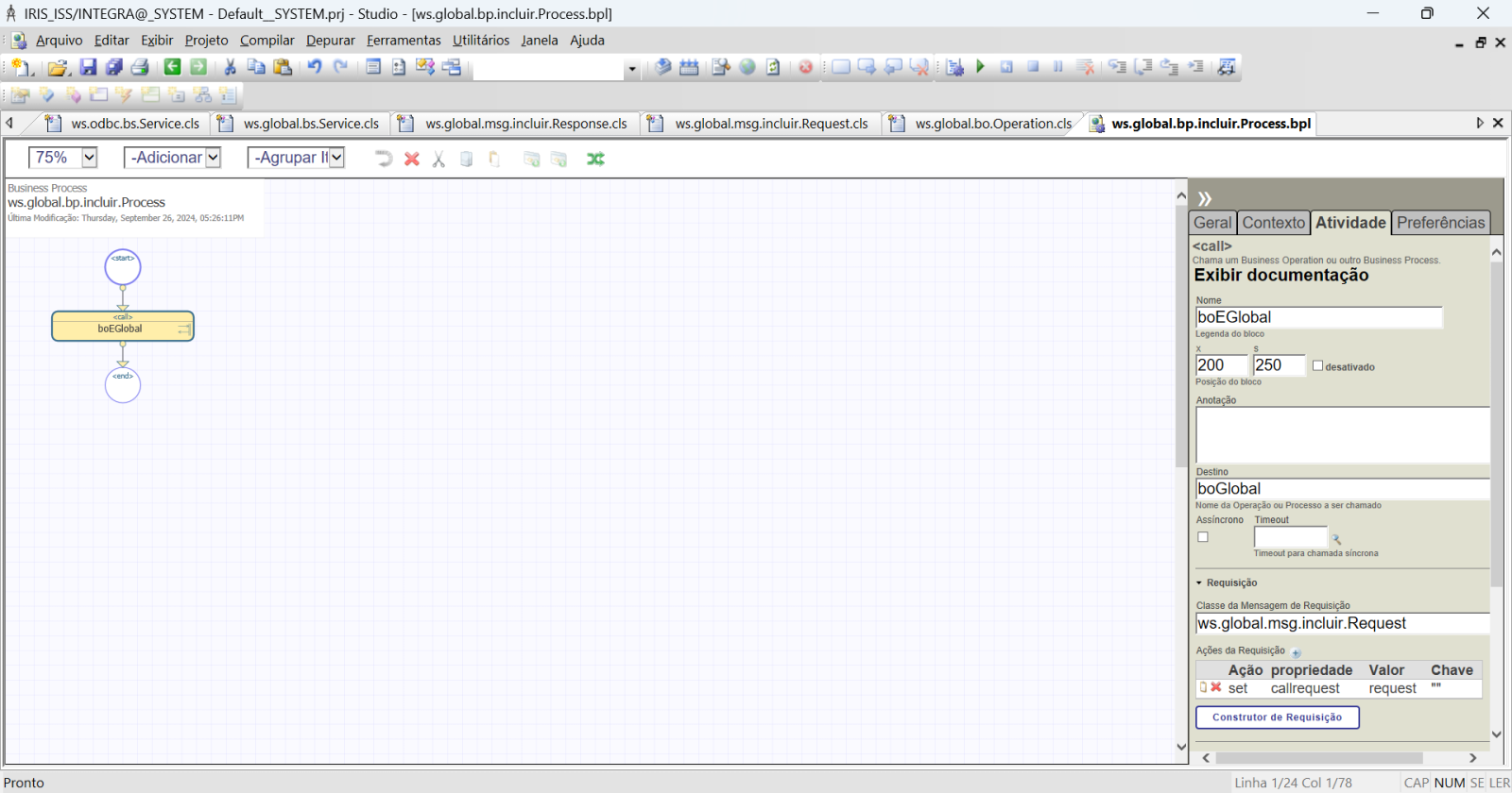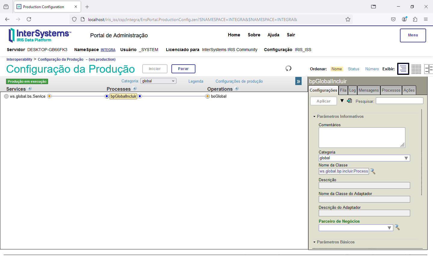 Agora vamos voltar ao nosso BS e ativá-lo. Assim a integração fará a leitura dos registros que existem na tabela e criará a global ^Cliente: