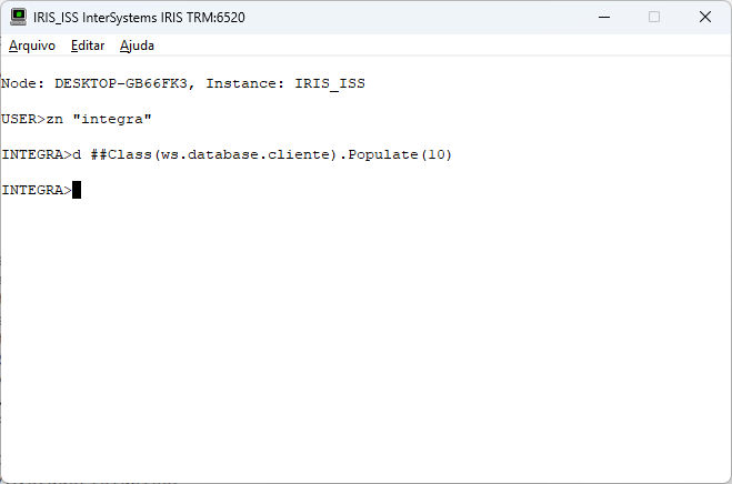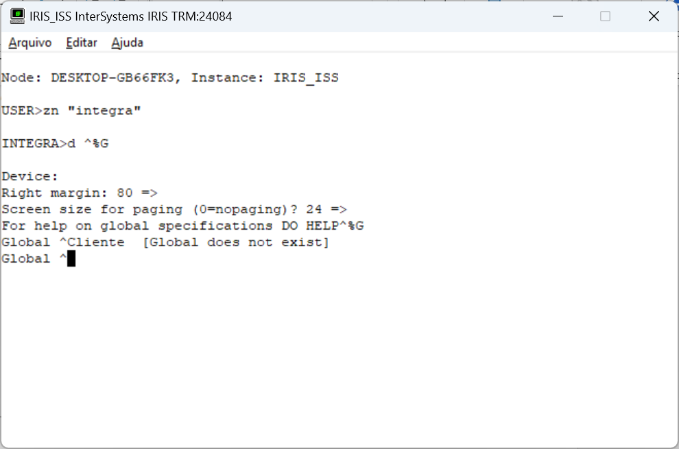 Agora vamos verificar a global que receberá os dados que virão da tabela externa. Abra um terminal do IRIS e vá para nosso namespace de desenvolvimento. No cado do nosso exemplo é o INTEGRA: