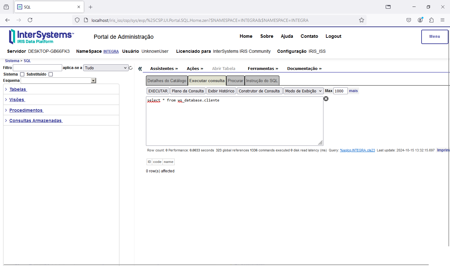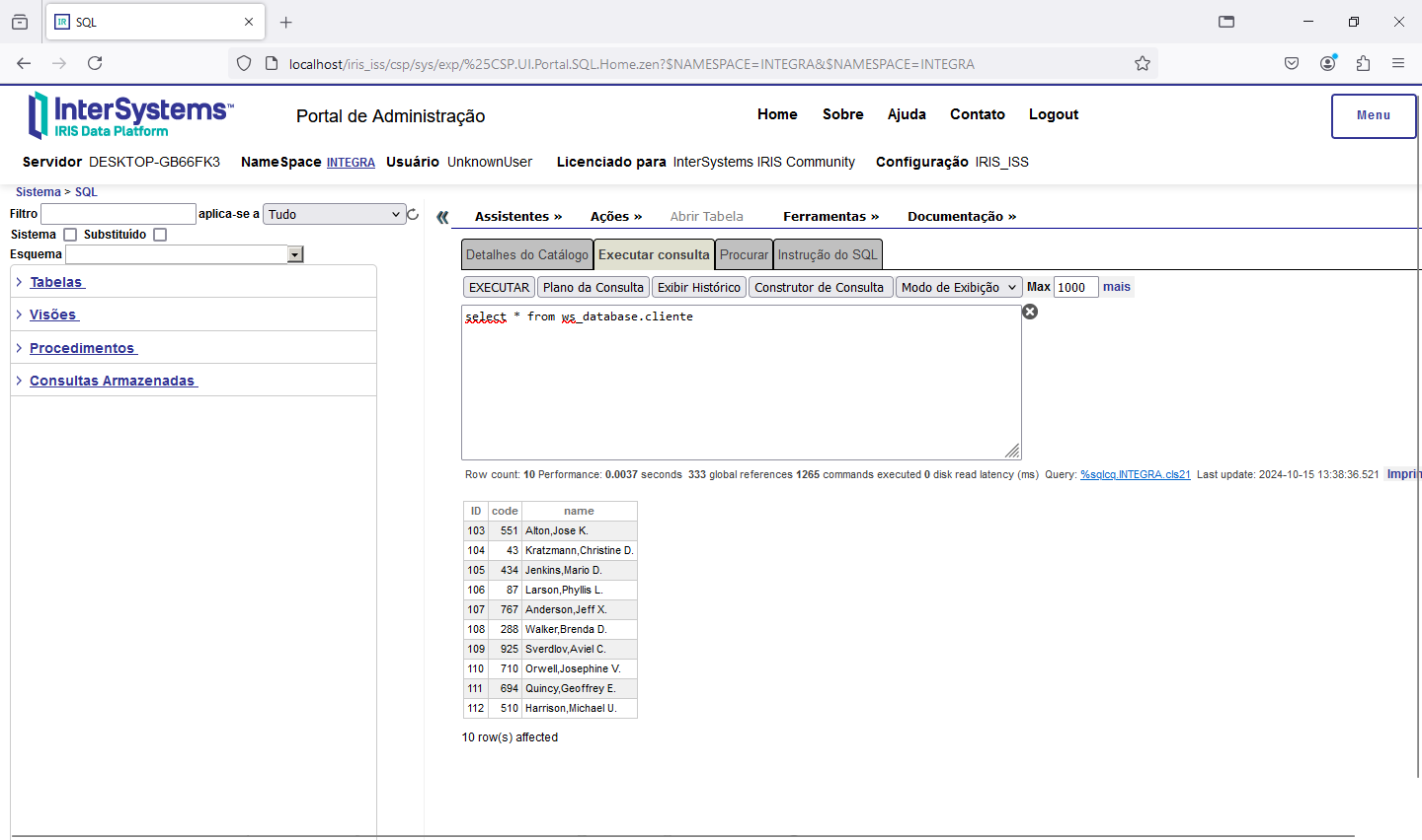 Agora abra o Painel de Administração do IRIS, vá em Explorer do Sistema->SQL e mude para o namespace INTEGRA: