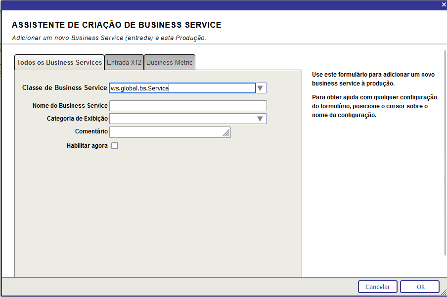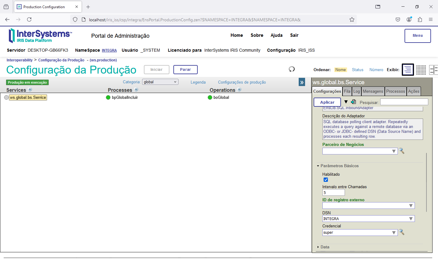 Note que nosso BS usa o adaptador EnsLib.SQL.InboundAdapter. Isso habilita nosso BS a consumir a tabela externa. Vamos precisar depois realizar algumas configurações no BS, mas faremos isso quando formos coloca-lo na produção.