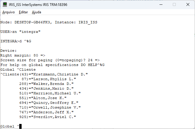 Volte ao terminal e execute o utilitário ^%G e verifique agora a nossa global ^Cliente: