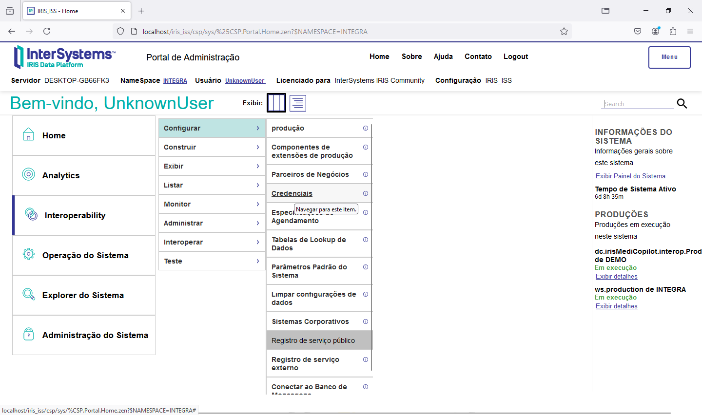 Agora vamos utilizar a production que criamos no exemplo anterior e colocar as classes nela e realizar algumas configurações. A primeira será criar uma credencial para autenticação do acesso ODBC. Vamos em Interoperabilidade->Configurar->Credenciais a partir do painel de Administração do IRIS: