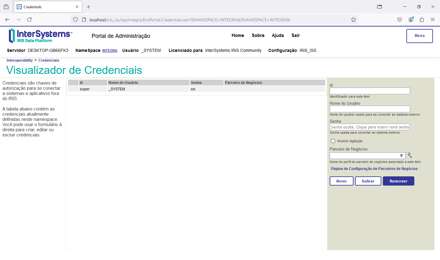 Agora crie uma nova credencial. Informe ID = super, Nome do usuário = _SYSTEM e Senha a senha do seu usuário _SYSTEM (padrão é SYS). Você pode criar um usuário para este acesso caso deseje. Estamos usando o _SYSTEM somente para facilitar o teste.
