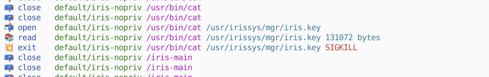 Para isso, precisamos aplicar uma Política de Rastreamento que impõe um matchAction. Essas políticas são um pouco envolvidas, mas esta é a maneira longa de dizer "Ei, se você executar cat /usr/irissys/mgr/iris.key, vou matá-lo (SIGKILL você).