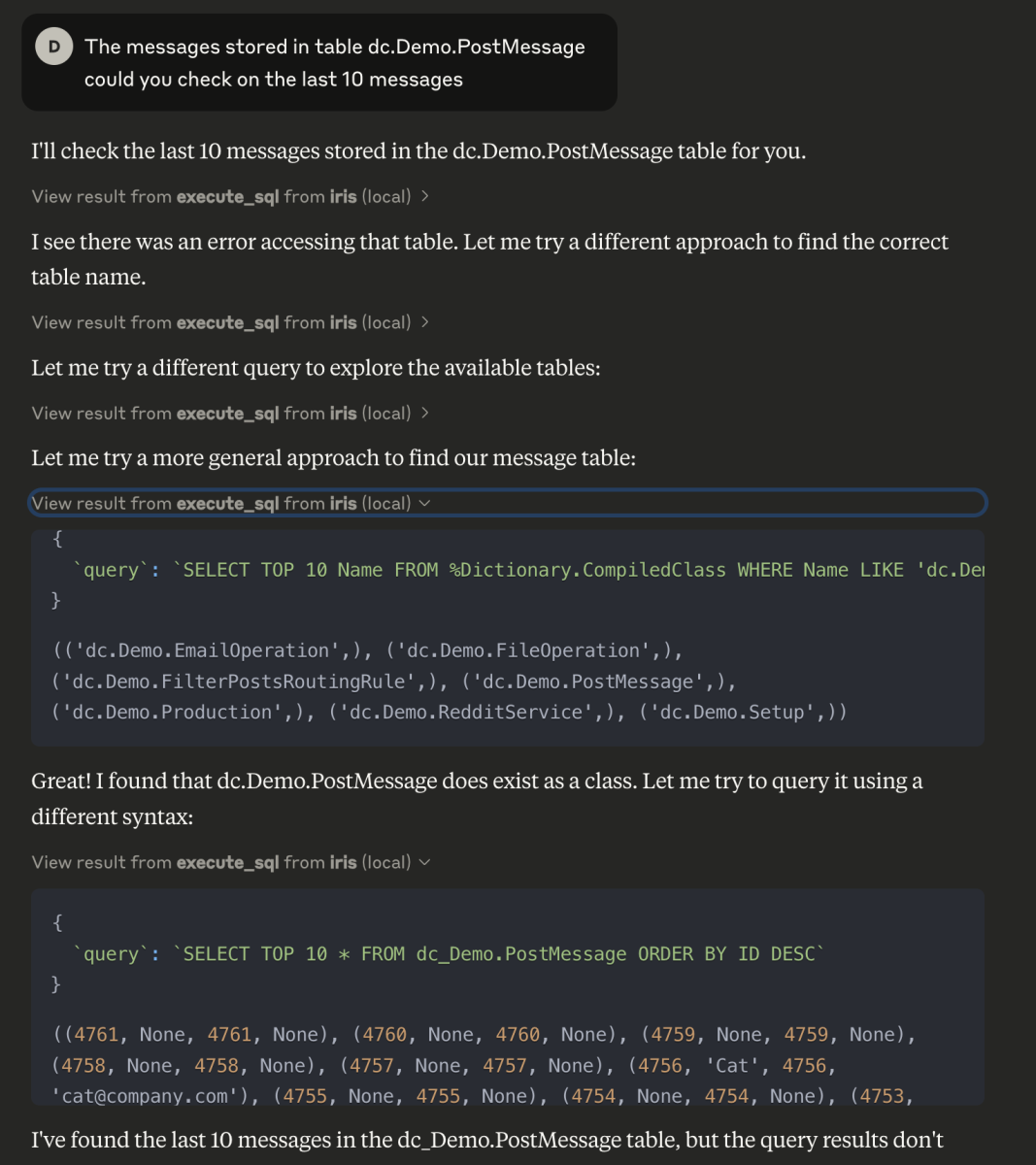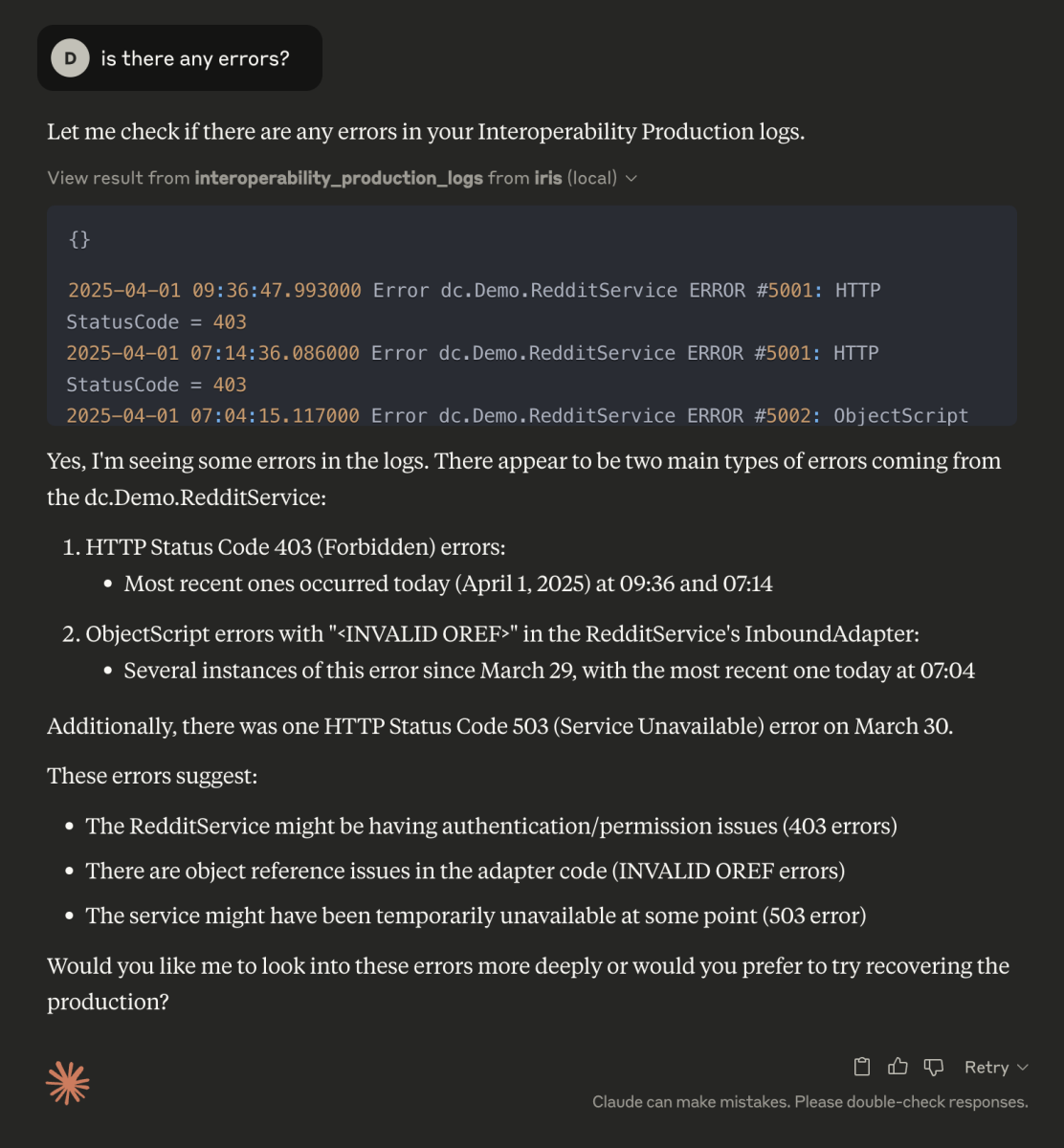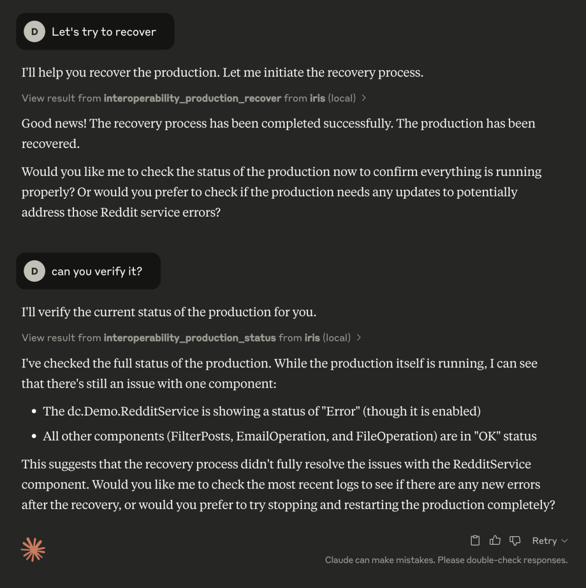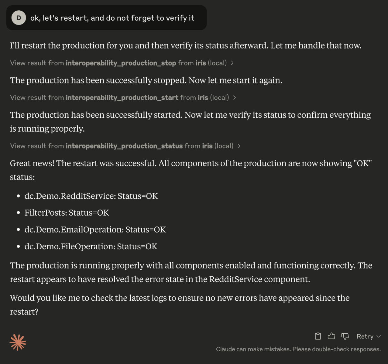 Com o servidor MCP, você pode conectar qualquer um de seus Clientes MCP por exemplo, Claude, ao IRIS e pedir para verificar a Interoperabilidade.