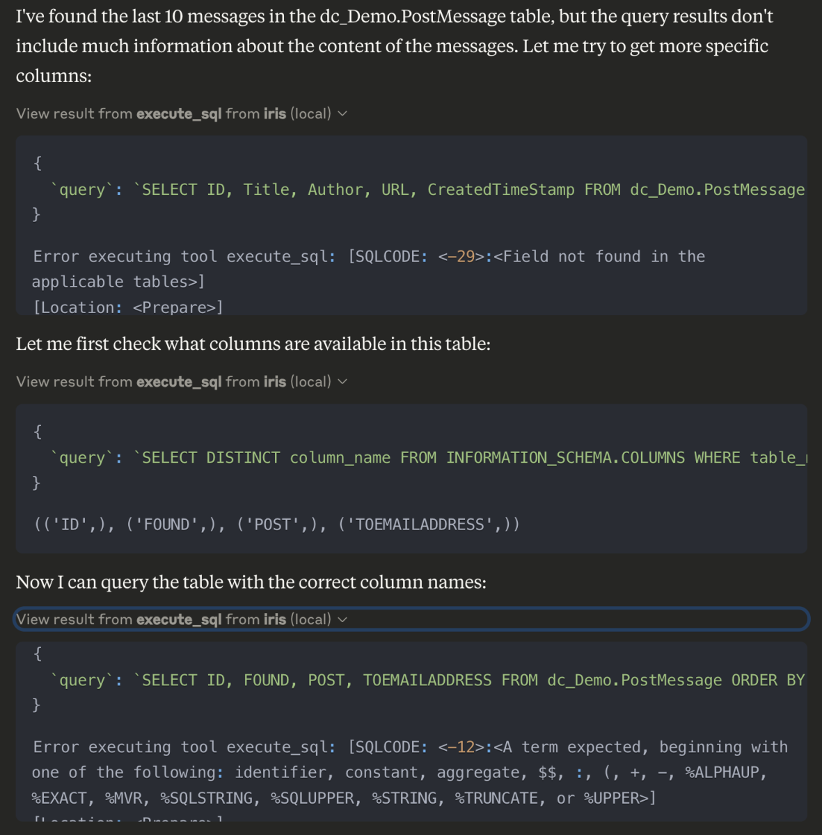 Encontrou as colunas reais, mas teve dificuldades com palavras-chave reservadas e não tentou usar "FOUND".