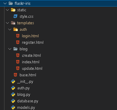Vamos seguir a estrutura apresentada nesse Tutorial, adaptando as conexões para o IRIS. Isso deve minimizar seus problemas ao aprimorar sua aplicação, já que você poderá consultar a Documentação Flask sem conflitos. Contudo, já que o Flask é bastante flexível, ele não demanda que você siga nenhum tipo de layout, então você pode considerar os passos a seguir como meras sugestões.