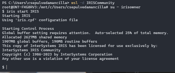 Depois de conectado, inicialize o IRIS (uma dica profissional, faça isso com wsl.conf!)